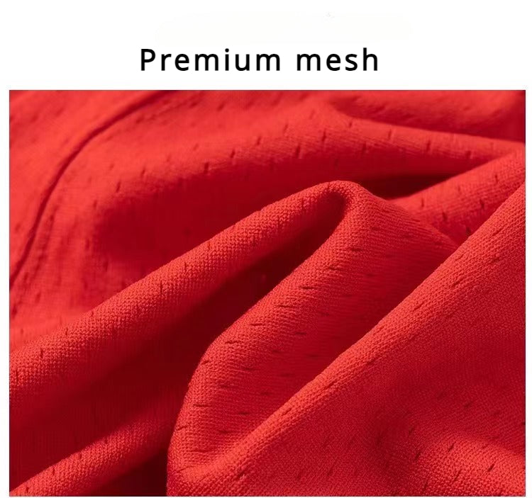 • Mesh Shorts: Lightweight, breathable athletic mesh; elastic waistband + drawcord; side pockets.