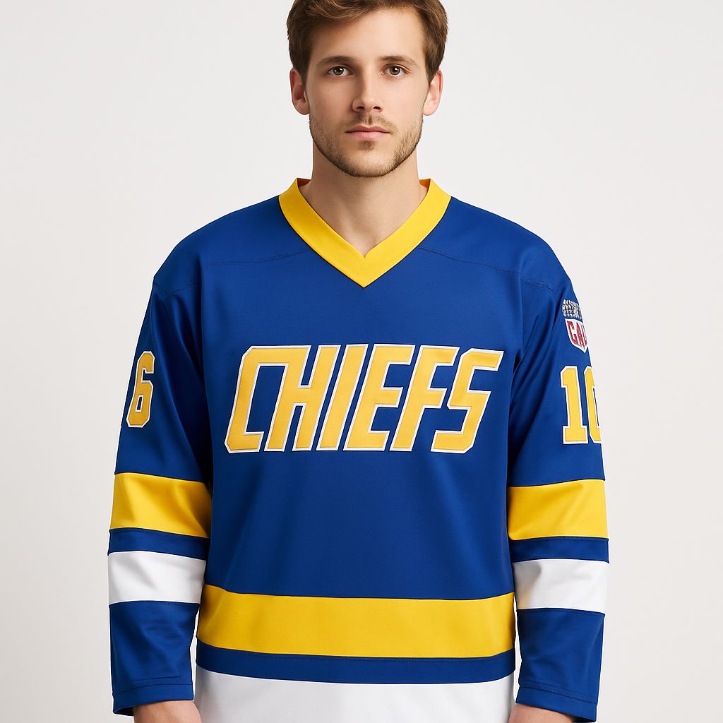Featuring fully embroidered name and number, authentic Chiefs striping, and premium mesh fabric, this jersey is a must-have for fans of vintage hockey, movie memorabilia, and those who play the game with fists and flair.