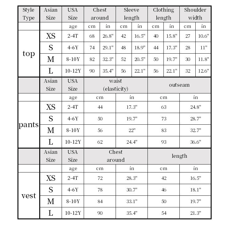 • options includes:  Top, pants, Vest